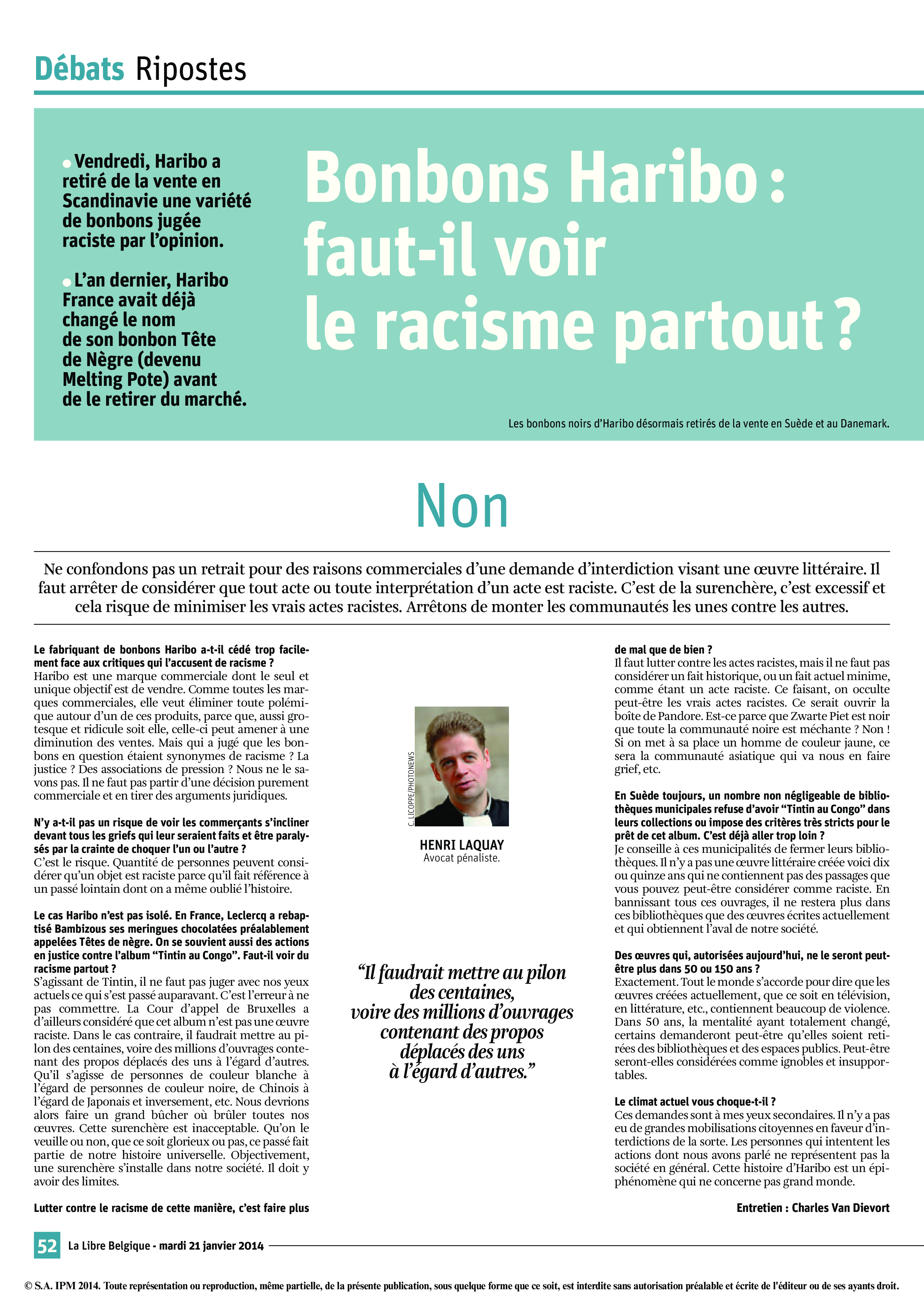 La Libre Belgique, 21/1/2014. Interview pleine page de Me Henri LAQUAY.