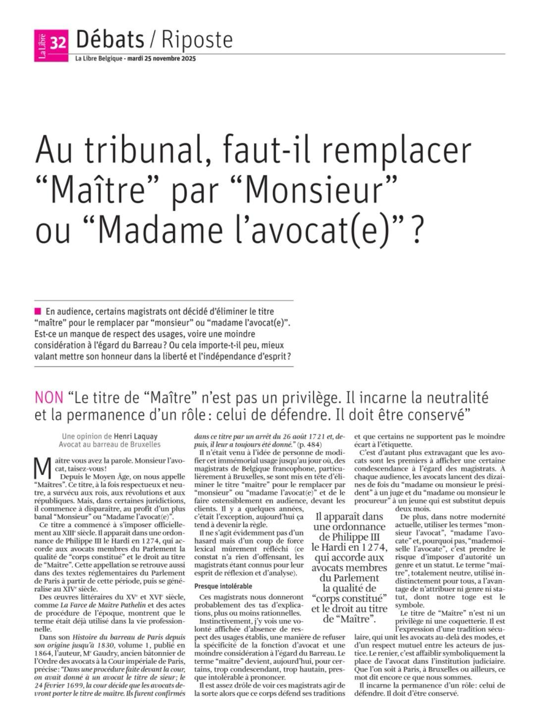 Article de Me Henri Laquay dans LA LIBRE BELGIQUE du 25/11/2025 : « Au tribunal faut-il remplacer « Maître » par « monsieur » ou « madame l’avocat(e) » ? Réponse argumentée de Me Henri Laquay : NON.